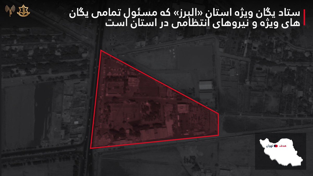 The Israel Defense Forces announced the completion of their 12th wave of strikes in Tehran. In Alborz province, Israeli forces struck the headquarters of a special Iranian security unit responsible for commanding all regime special forces across the province. In other parts of Tehran, the IDF targeted IRGC and Basij facilities along with a central domestic security forces headquarters. Dozens of additional sites used for weapons storage and production were also struck.